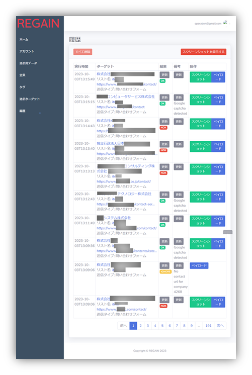 自動フォーム投稿機能や一斉メール配信を行った結果は履歴管理画面にて確認することが可能です。宣伝が失敗した相手先に対しては、ペイロード画面にて相手先へ送るはずだった文面などを確認(コピー&ペースト)することができ、簡単に手動対応して頂ける機能をご提供しています。