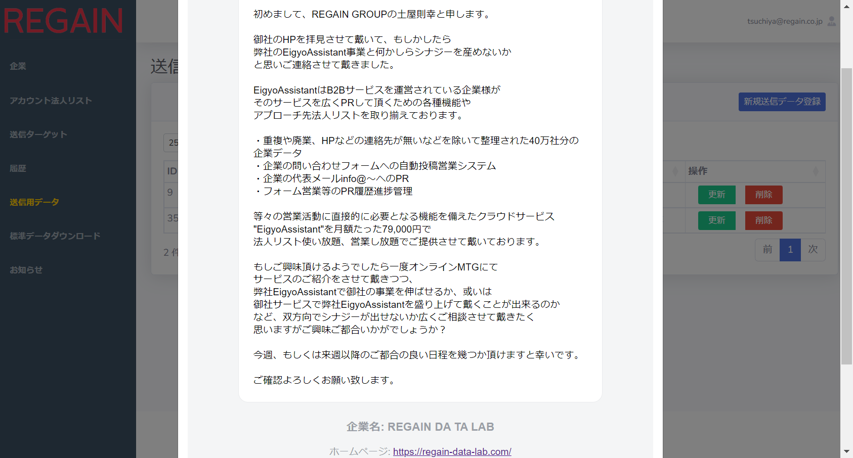メールアドレスが分かっている法人に対してPRを行うための一斉メール配信機能も搭載されています。