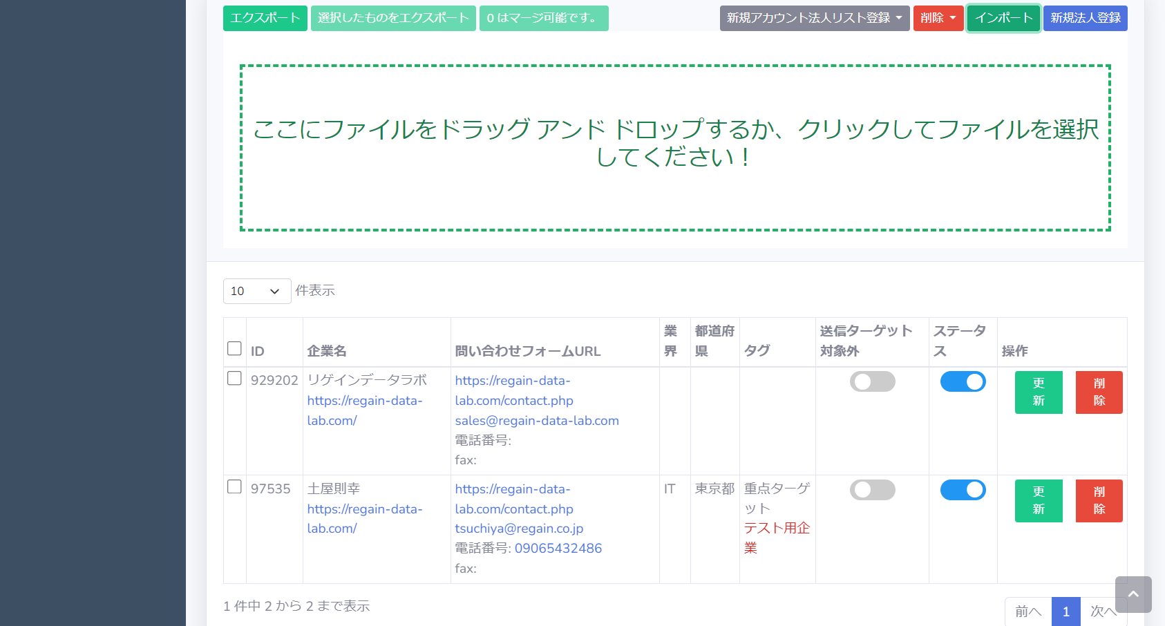 EigyoAssistantで用意している法人リストだけでなく、貴社で既に活用されている法人リストをインポートして自動フォーム投稿営業や一斉メール配信を行って頂くことも可能です。